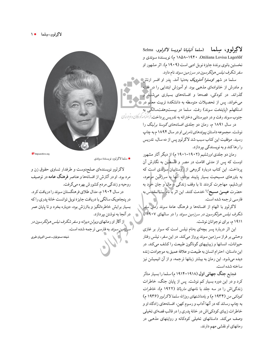 لاگِرلوو، سِلما (سلما اُتیلیانا لوویسا لاگرلوو، Selma Ottiliana Lovisa Lagerlöf، 1940-1858 م) نویسندۀ سوئدی و نخستین بانوی برندۀ جایزۀ نوبل ادبی است (1909 م). اثر مشهور او سفر شگرف نیلس هولگرسون در سرزمین سوئد نام دارد.