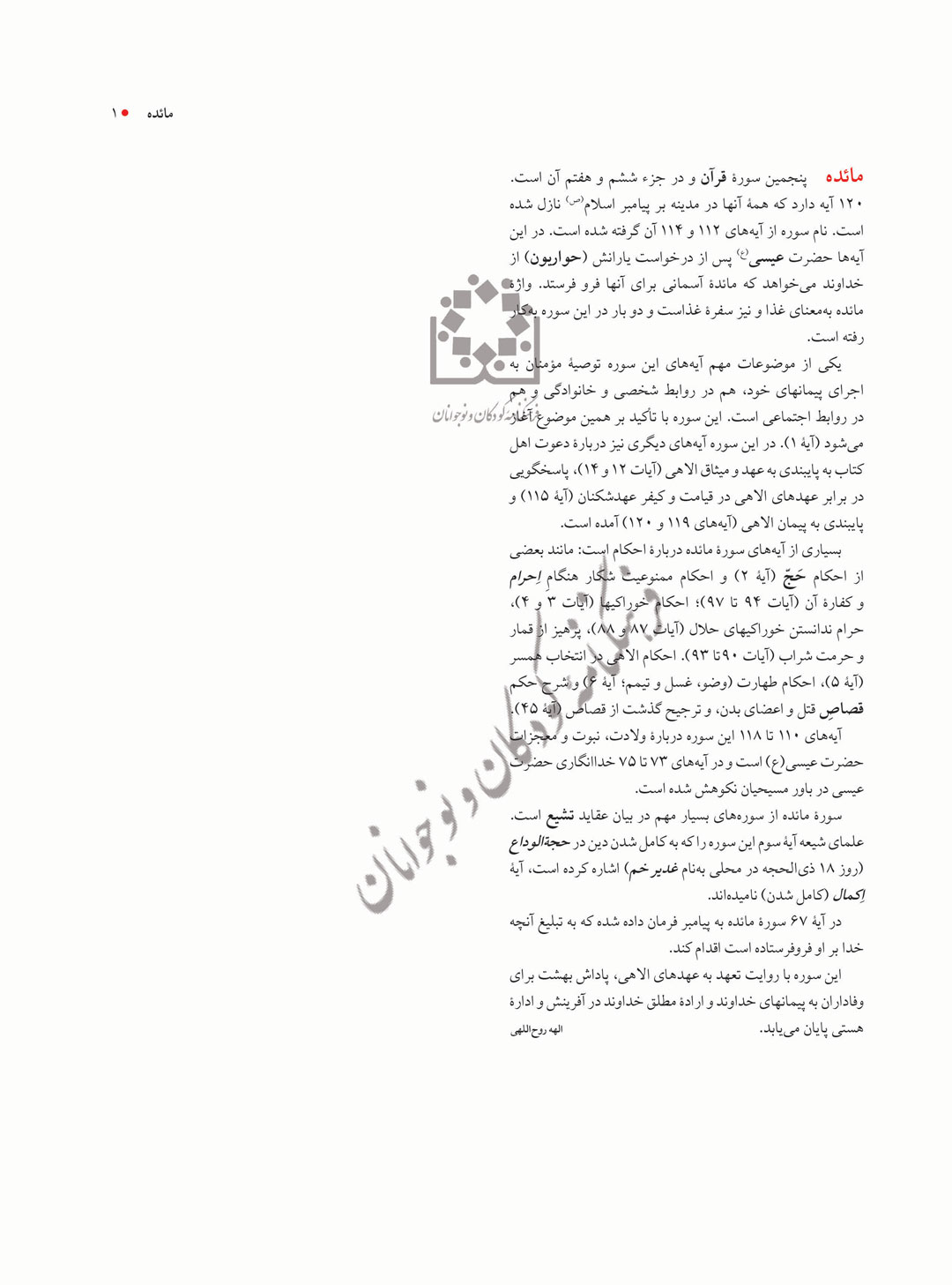 مائده پنجمین سورۀ قرآن و در جزء ششم و هفتم آن است. 120 آیه دارد که همۀ آنها در مدینه بر پیامبر اسلام(ص) نازل شده است. نام سوره از آیههای 112 و 114 آن گرفته شده است. در این آیهها حضرت عیسی(ع) پس از درخواست یارانش (حواریون) از خداوند میخواهد که مائدۀ آسمانی برای آنها فرو فرستد. واژۀ مائده بهمعنای غذا و نیز سفرۀ غذاست و دو بار در این سوره بهکار رفته است.