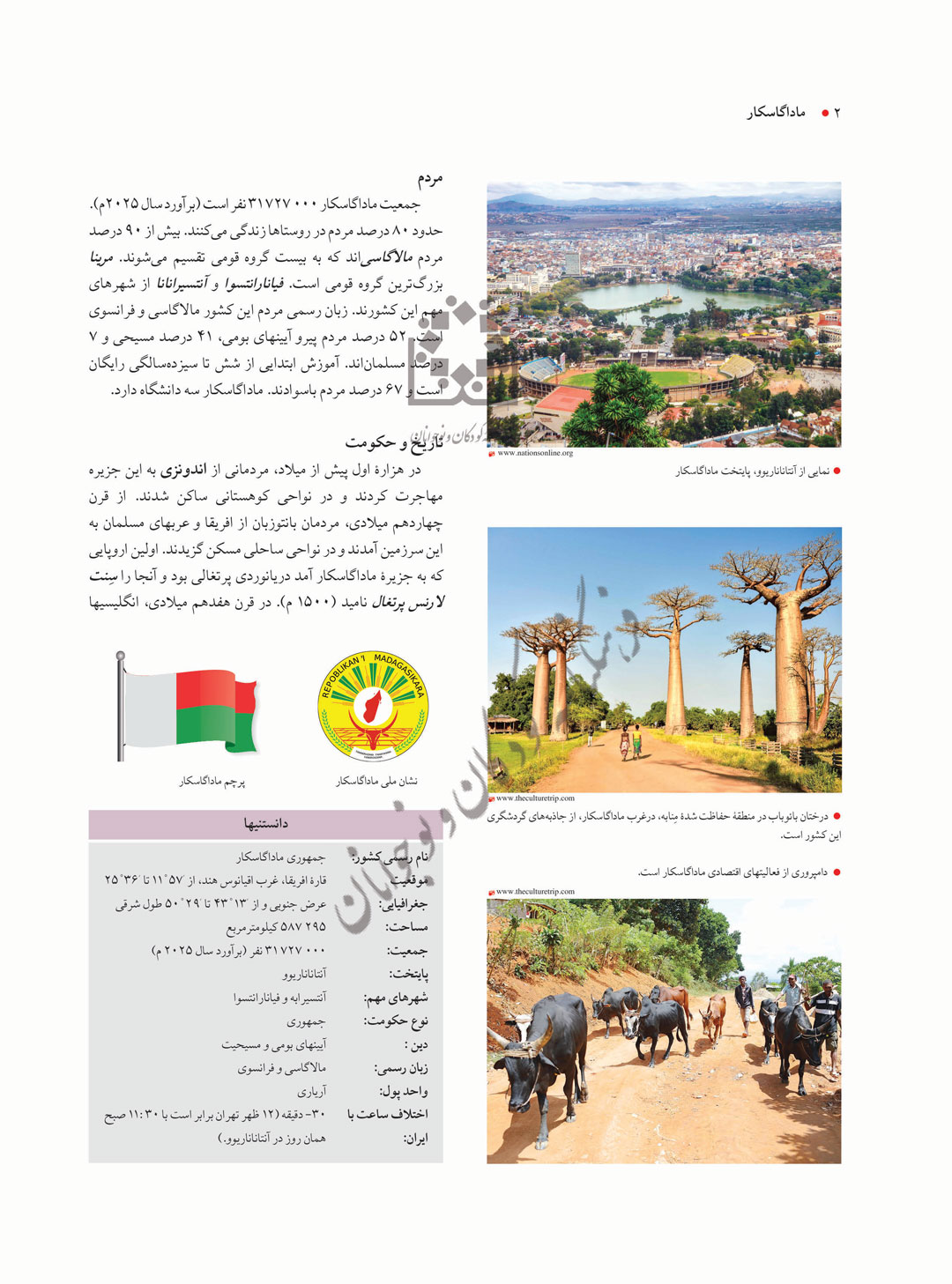 ماداگاسکار (مالاگاسی) کشوری است در جنوب شرقی افریقا و در غرب اقیانوس هند که از یک جزیرۀ بزرگ اصلی و چند جزیرۀ کوچک تشکیل شده است. تنگۀ موزامبیک آن را از سرزمین اصلی افریقا جدا میکند. مساحت این کشور 295 587 کیلومترمربع و پایتخت آن آنتاناناریوو است. ماداگاسکار ماداگاسکار ماداگاسکار