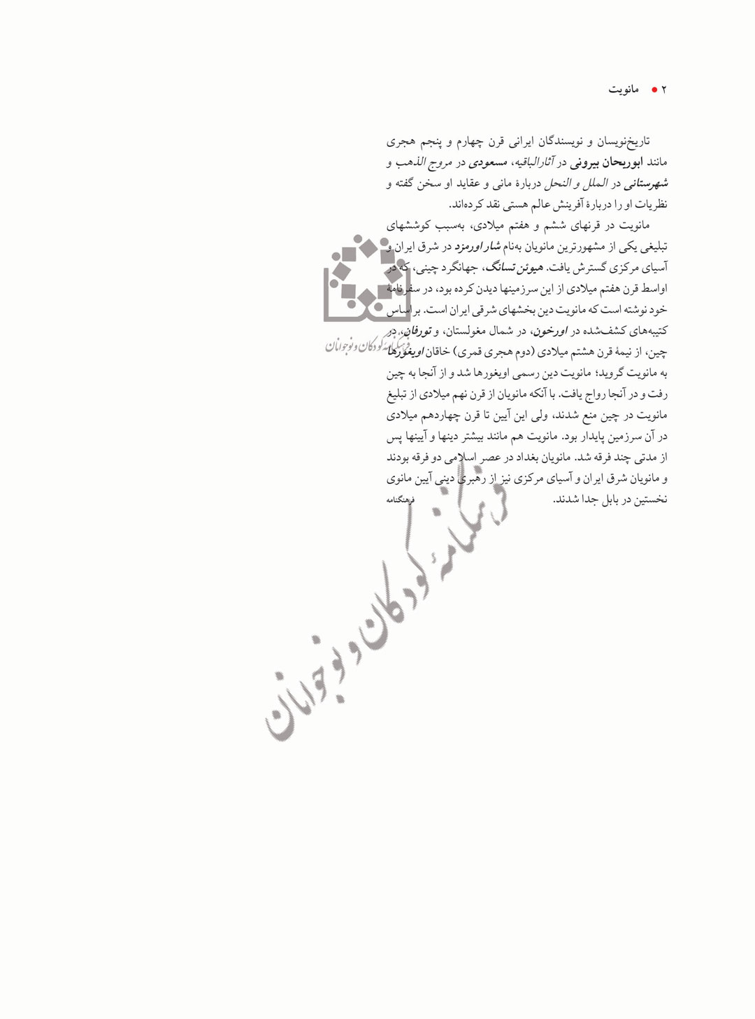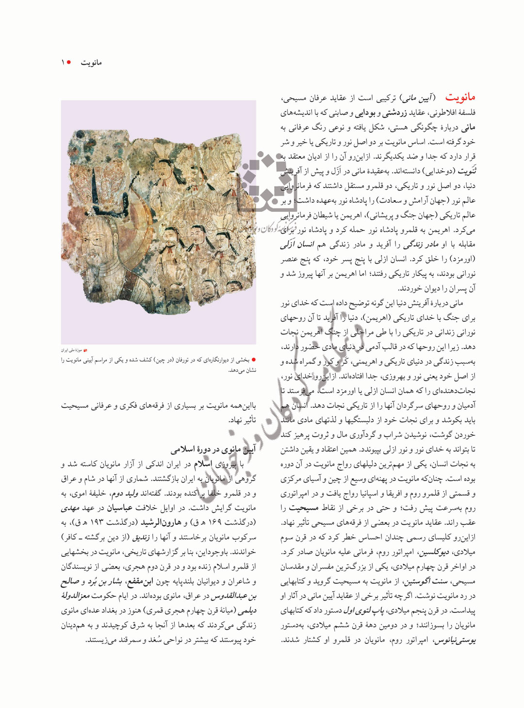 مانویت (آیین مانی) ترکیبی است از عقاید عرفان مسیحی، فلسفۀ افلاطونی، عقاید زردشتی و بودایی و صابئی که با اندیشههای مانی دربارۀ چگونگی هستی، شکل یافته و نوعی رنگ عرفانی به خود گرفته است. اساس مانویت بر دو اصل نور و تاریکی یا خیر و شر قرار دارد که جدا و ضد یکدیگرند. ازاینرو آن را از ادیان معتقد به ثَنَویت (دوخدایی) دانستهاند. بهعقیدۀ مانی در اَزَل و پیش از آفرینش دنیا، دو اصل نور و تاریکی، دو قلمرو مستقل داشتند که فرمانروایی عالم نور (جهان آرامش و سعادت) را پادشاه نور بهعهده داشت؛ و بر عالم تاریکی (جهان جنگ و پریشانی)، اهریمن یا شیطان فرمانروایی میکرد. اهریمن به قلمرو پادشاه نور حمله کرد و پادشاه نور برای مقابله با او مادر زندگی را آفرید و مادر زندگی هم انسان اَزَلی (اورمزد) را خلق کرد. انسان ازلی با پنج پسر خود، که پنج عنصر نورانی بودند، به پیکار تاریکی رفتند؛ اما اهریمن بر آنها پیروز شد و آن پسران را دیوان خوردند.