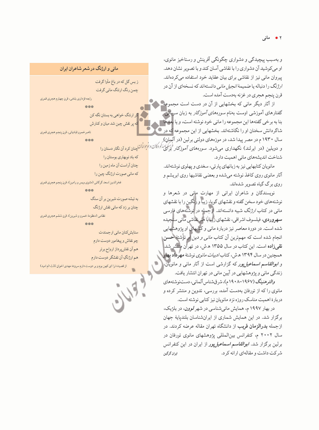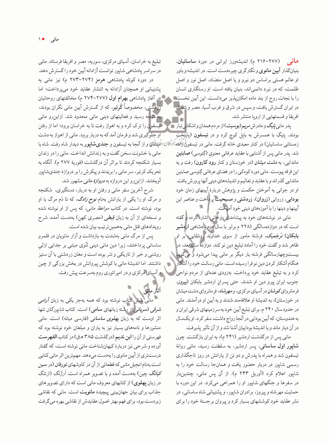 مانی (277-216 م) اندیشهورز ایرانی در دورۀ ساسانیان، بنیانگذار آیین مانوی و نگارگری چیرهدست است. در اندیشه و باور او عالم هستی براساس دو نیرو و یا اصل متضاد، اصل نور و اصل ظلمت، که در نبرد دائمیاند، بنیان یافته است. او رستگاری انسان را با نجات روح از بند ماده امکانپذیر میدانست. این آیین نخست در ایران گسترش یافت، و سپس در شرق و غرب آسیا، مصر و شمال افریقا و قسمتهایی از اروپا منتشر شد.