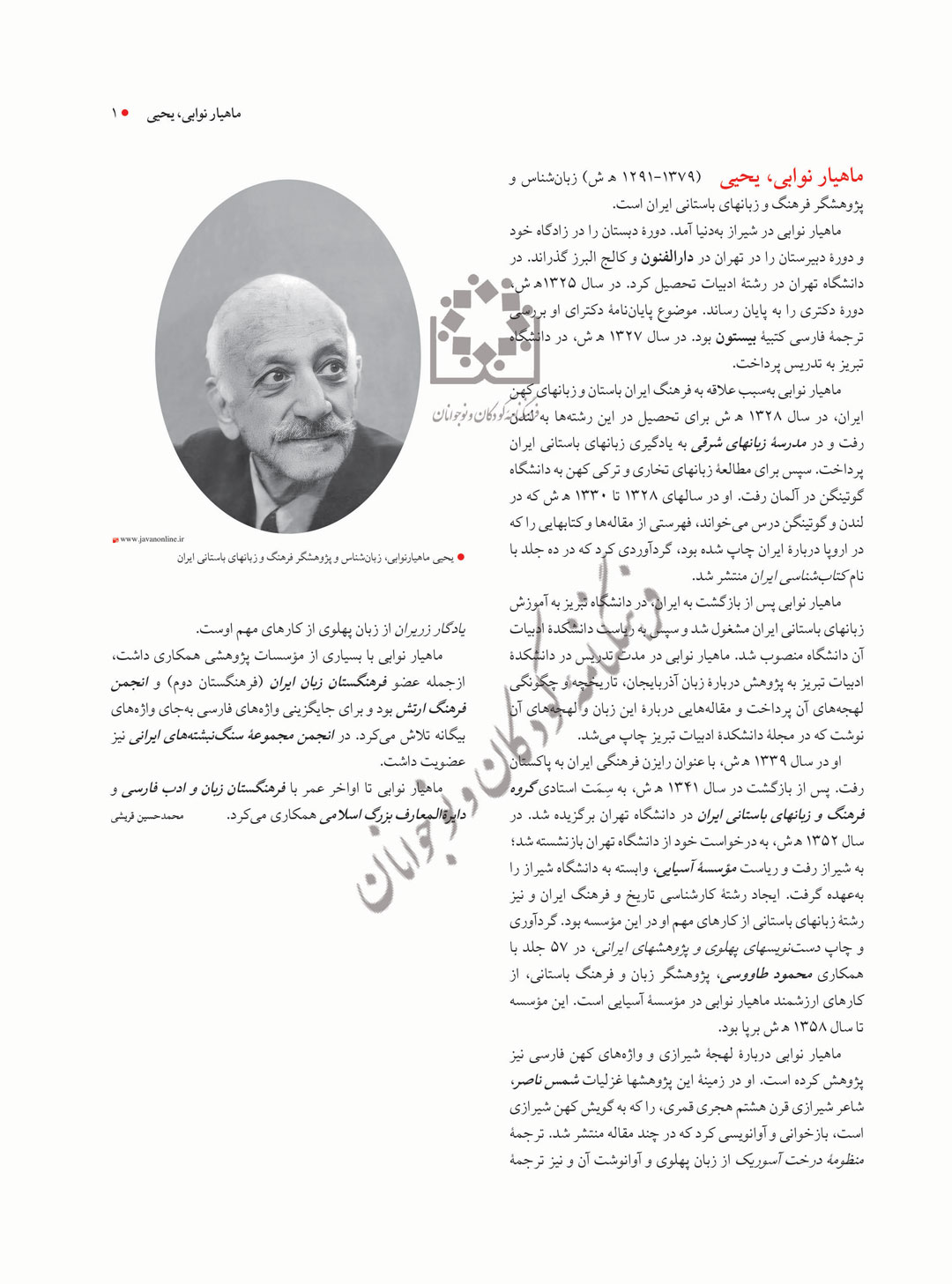 ماهیار نوابی، یحیی (1379-1291 ﻫ ش) زبانشناس و پژوهشگر فرهنگ و زبانهای باستانی ایران است.