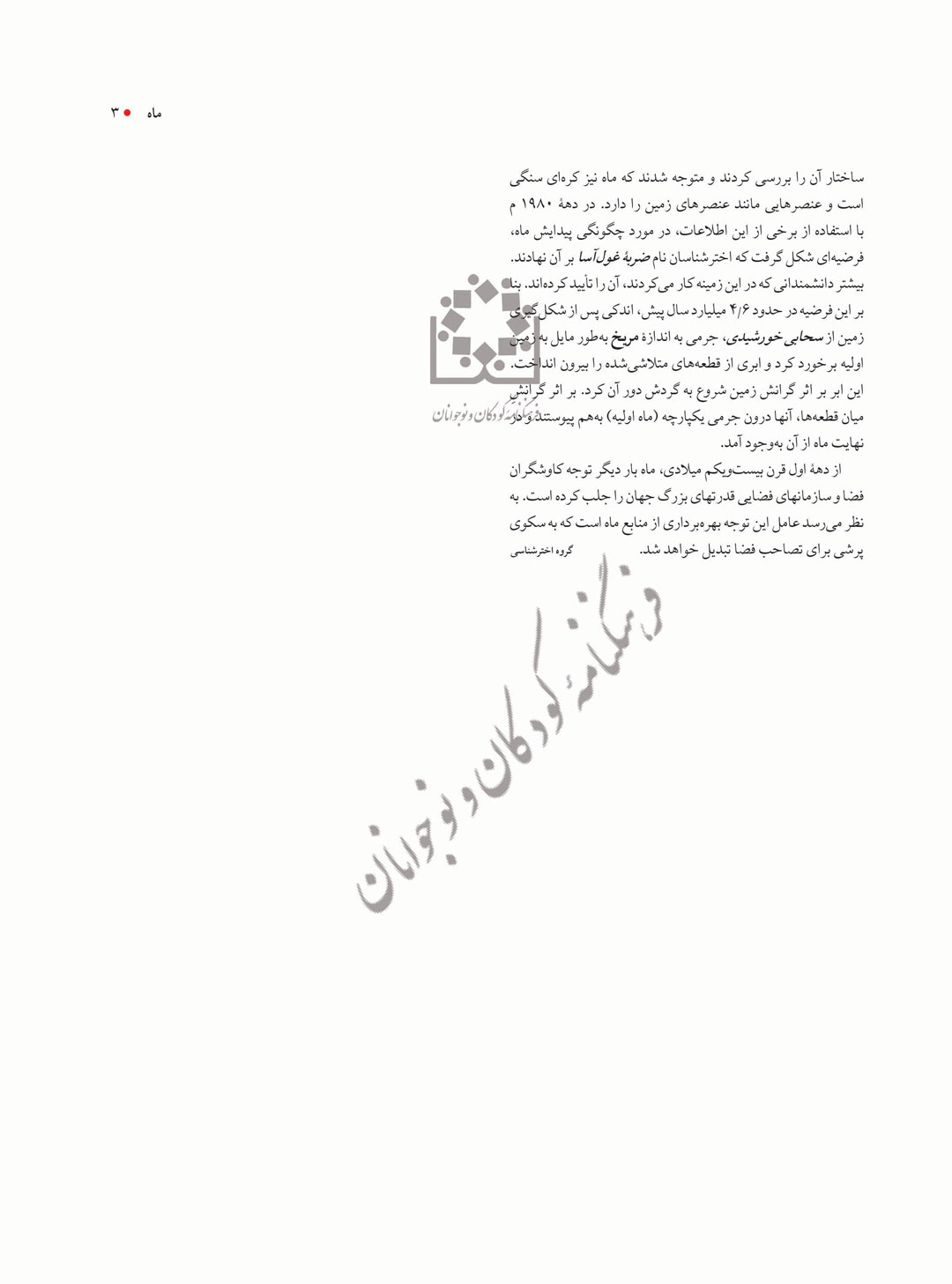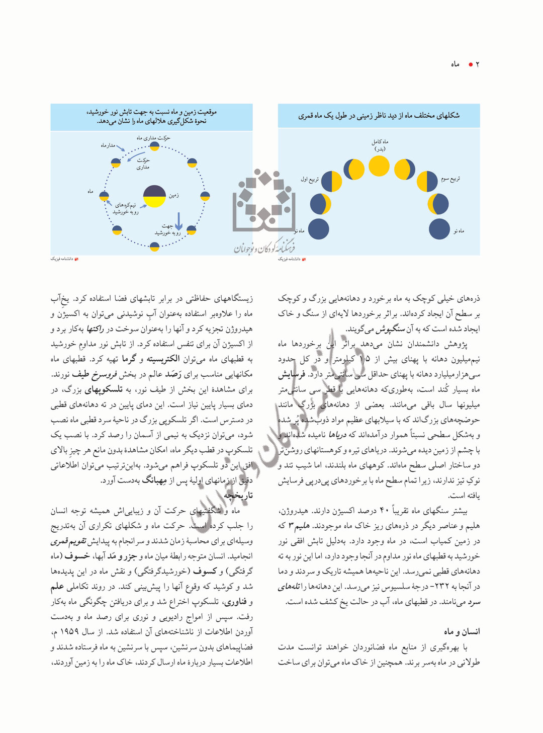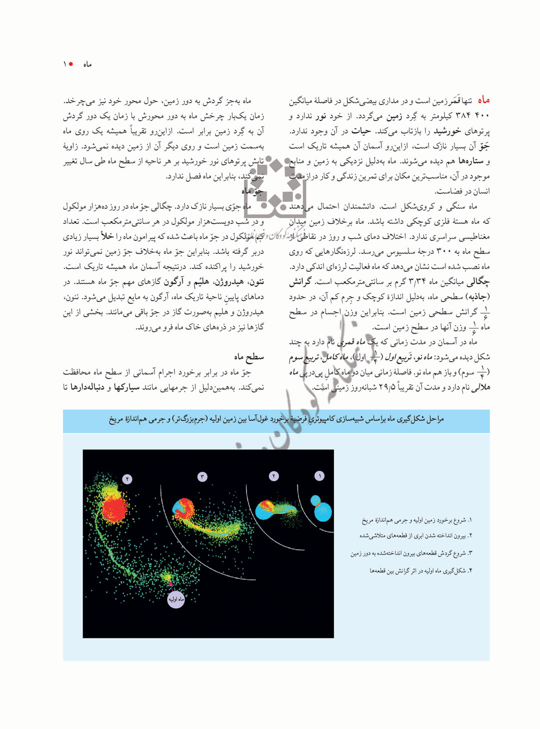 ماه تنها قَمَر زمین است و در مداری بیضیشکل در فاصلۀ میانگین 400 384 کیلومتر به گِرد زمین میگردد. از خود نور ندارد و پرتوهای خورشید را بازتاب میکند. حیات در آن وجود ندارد. جَوّ آن بسیار نازک است، ازاینرو آسمان آن همیشه تاریک است و ستارهها هم دیده میشوند. ماه بهدلیل نزدیکی به زمین و منابع موجود در آن، مناسبترین مکان برای تمرین زندگی و کار درازمدت انسان در فضاست.