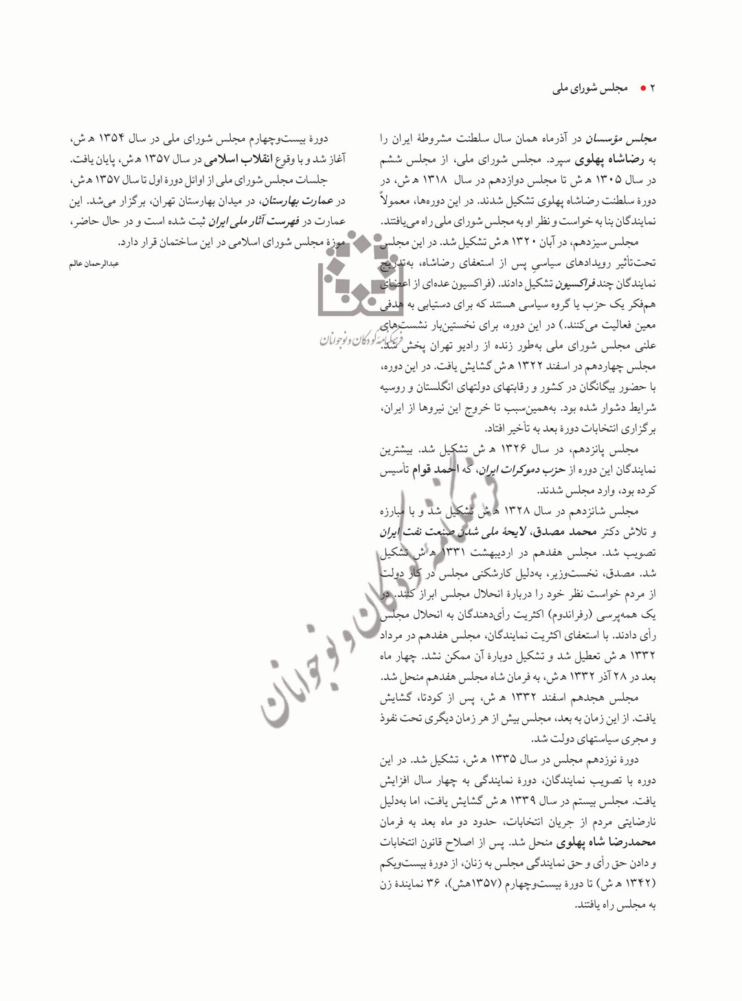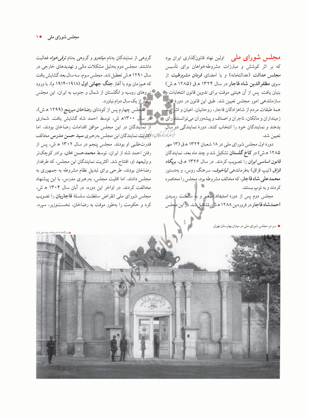 مجلس شورای ملی اولین نهاد قانونگذاری ایران بود که بر اثر کوشش و مبارزات مشروطهخواهان برای تأسیس مجلس عدالت (عدالتخانه) و با امضای فرمان مشروطیت از سوی مظفرالدین شاه قاجار در سال 1324 ﻫ ق (1285 ﻫ ش) بنیان یافت. پس از آن هیئتی موقت برای تدوین قانون انتخابات و سازماندهی امور مجلس تعیین شد. طبق این قانون در دورۀ اول، همۀ طبقات مردم از شاهزادگان قاجار، روحانیان، اعیان و اشراف، زمینداران و مالکان، تاجران و اصناف و پیشهوران میتوانستند رأی بدهند و نمایندگان خود را انتخاب کنند. دورۀ نمایندگی دو سال تعیین شد.