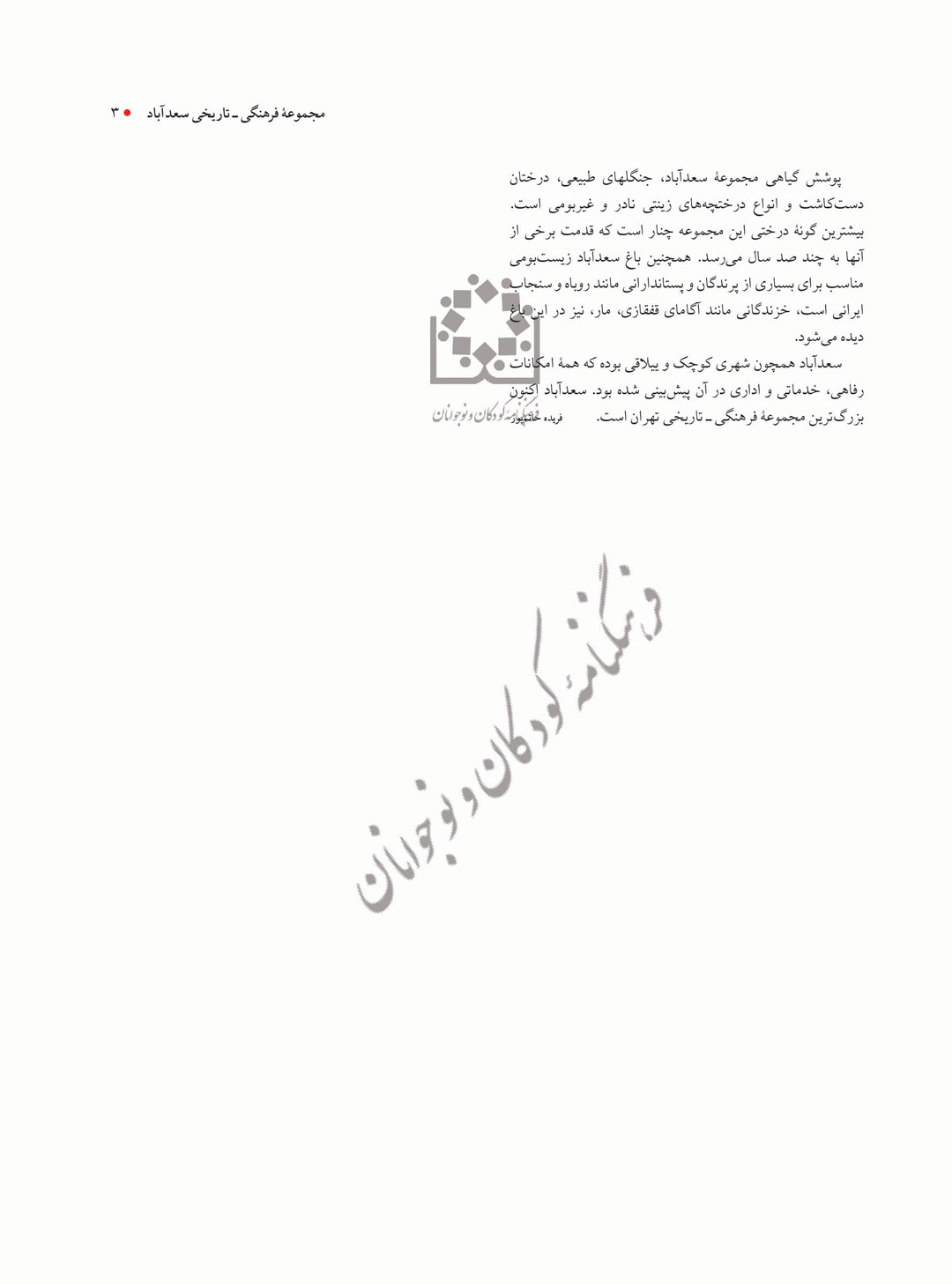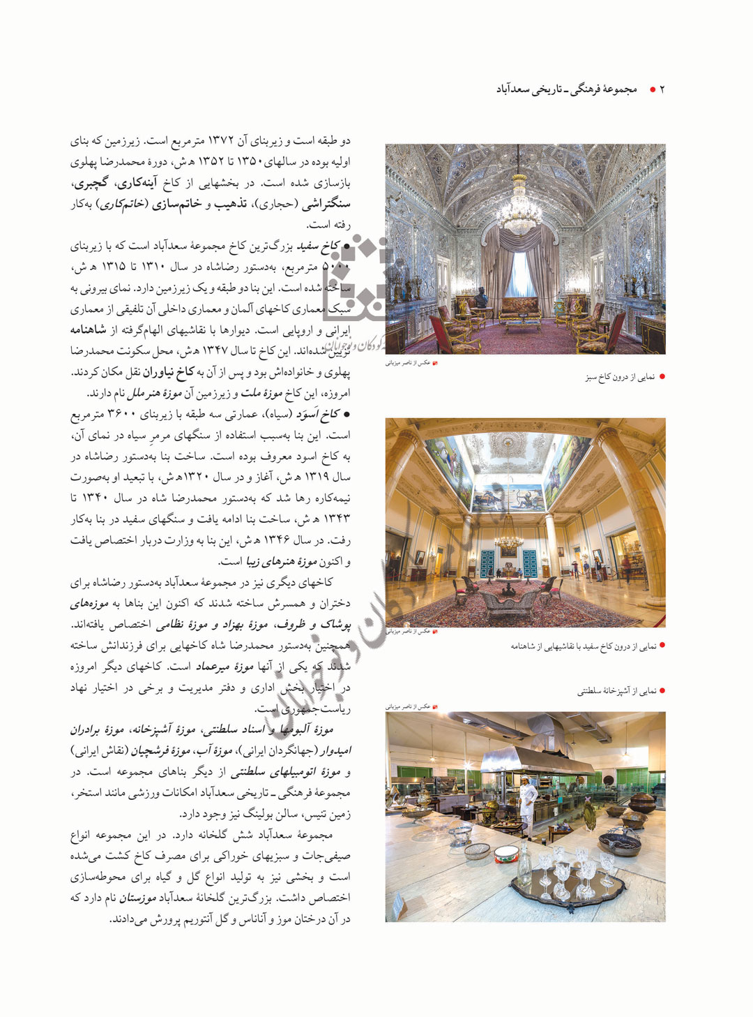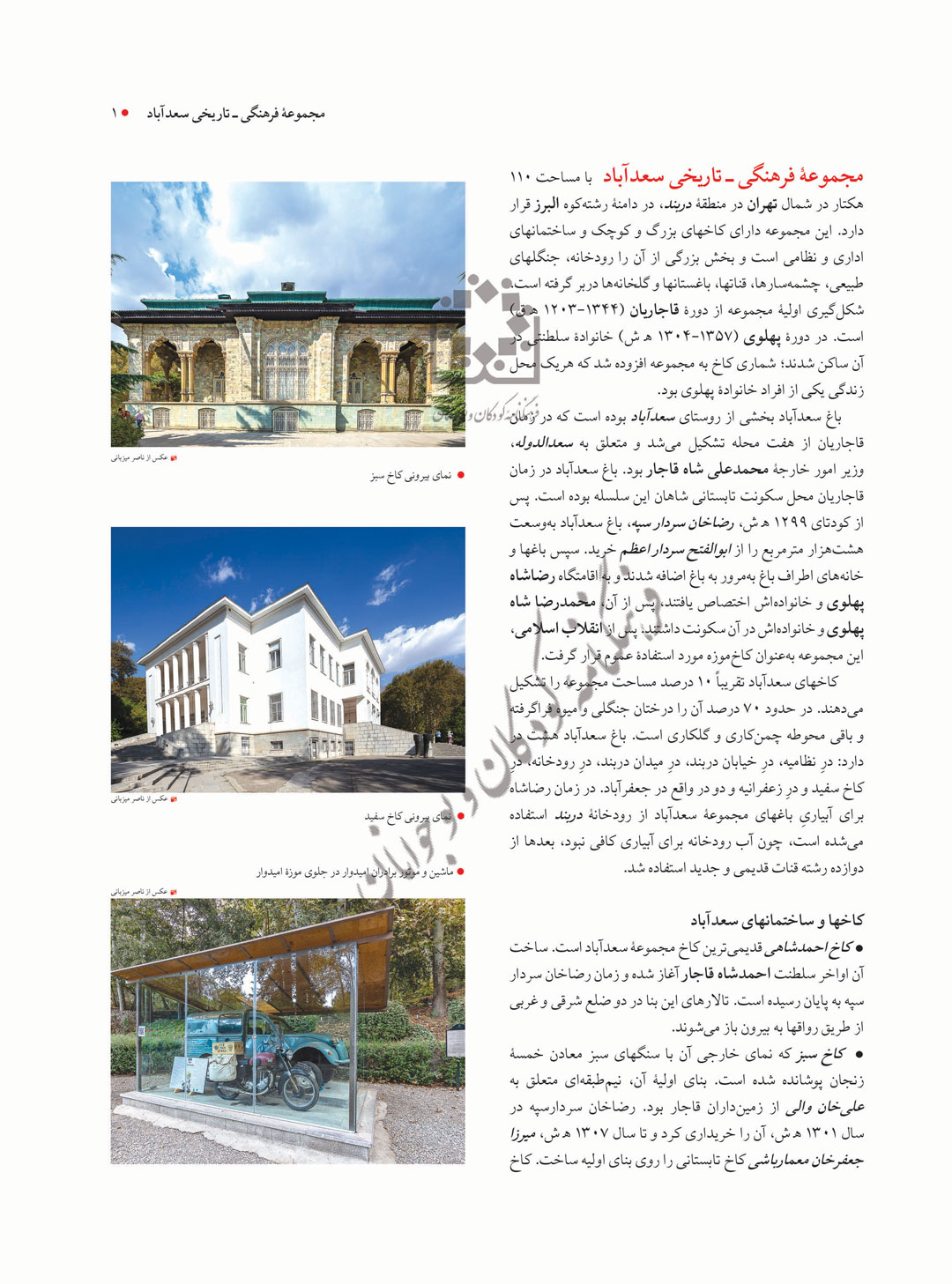 مجموعۀ فرهنگی ـ تاریخی سعدآباد با مساحت 110 هکتار در شمال تهران در منطقۀ دربند، در دامنۀ رشتهکوه البرز قرار دارد. این مجموعه دارای کاخهای بزرگ و کوچک و ساختمانهای اداری و نظامی است و بخش بزرگی از آن را رودخانه، جنگلهای طبیعی، چشمهسارها، قناتها، باغستانها و گلخانهها دربر گرفته است. شکلگیری اولیۀ مجموعه از دورۀ قاجاریان (1344-1203 ﻫ ق) است. در دورۀ پهلوی (1304-1357 ﻫ ش) خانوادۀ سلطنتی در آن ساکن شدند؛ شماری کاخ به مجموعه افزوده شد که هریک محل زندگی یکی از افراد خانوادۀ پهلوی بود.