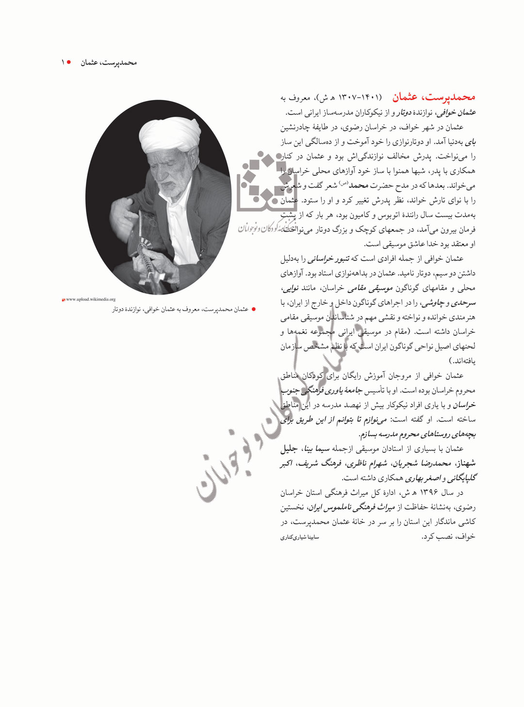 محمدپرست، عثمان (1401-1307 ﻫ ش)، معروف به عثمان خوافی، نوازندۀ دوتار و از نیکوکاران مدرسه‌ساز ایرانی است.