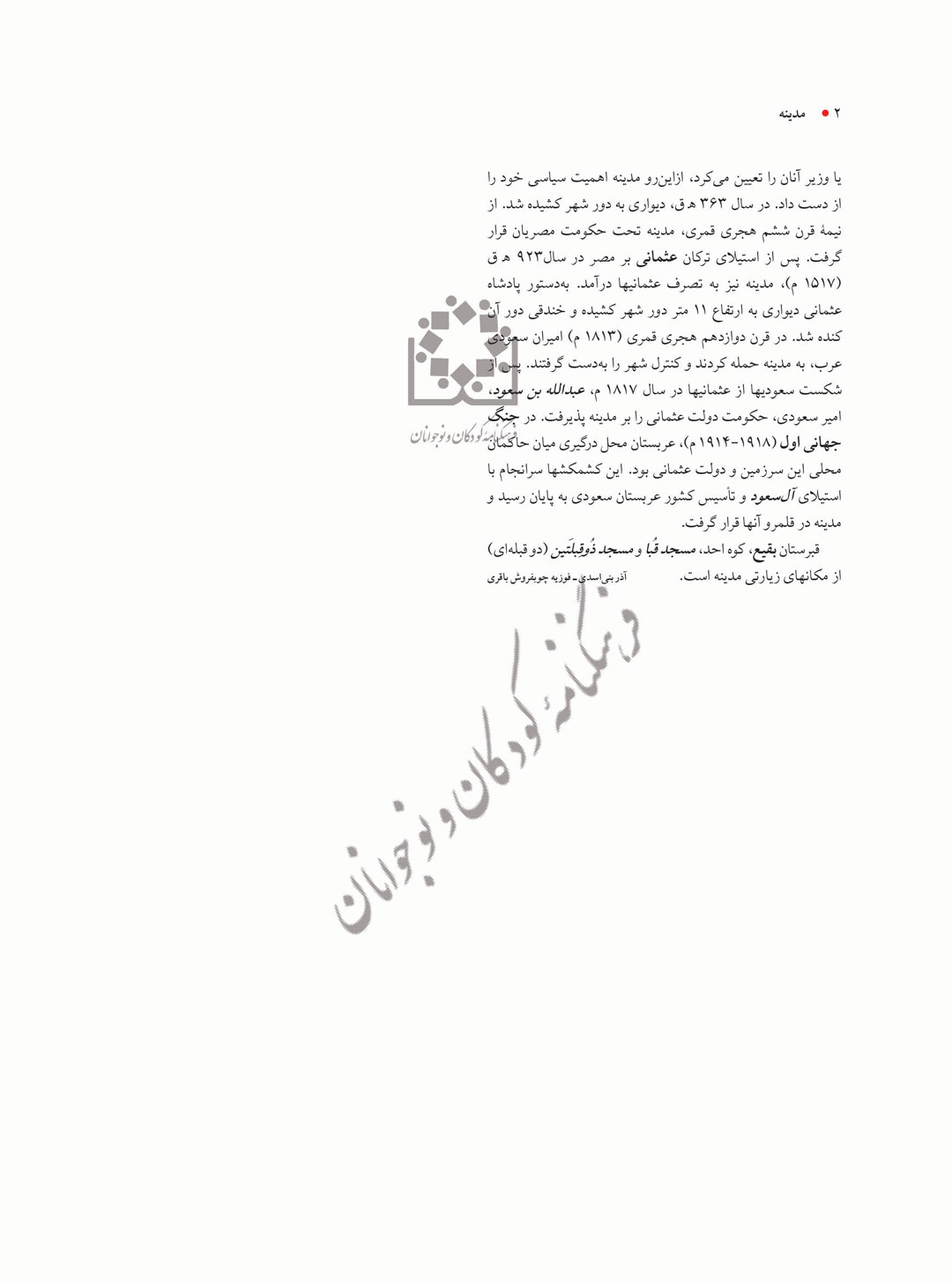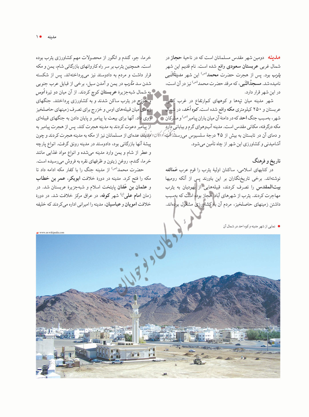 مدینه دومین شهر مقدس مسلمانان است که در ناحیۀ حجاز در شمال غربی عربستان سعودی واقع شده است. نام قدیم این شهر یثرب بود. پس از هجرت حضرت محمد(ص) این شهر مدینةُالَنبی نامیده شد. مسجدُالنَبی، که مرقد حضرت محمد(ص) نیز در آن است، در این شهر قرار دارد. مدینه مدینه