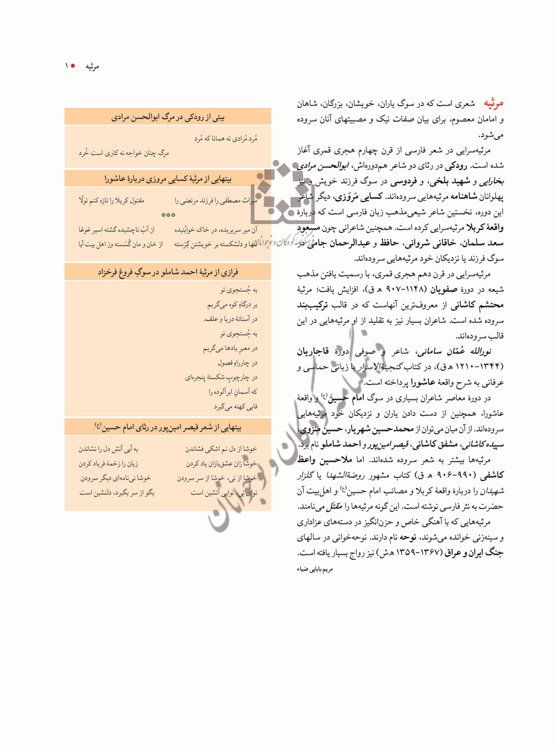 مرثیه شعری است که در سوگ یاران، خویشان، بزرگان، شاهان و امامان معصوم، برای بیان صفات نیک و مصبیتهای آنان سروده می‌شود.
