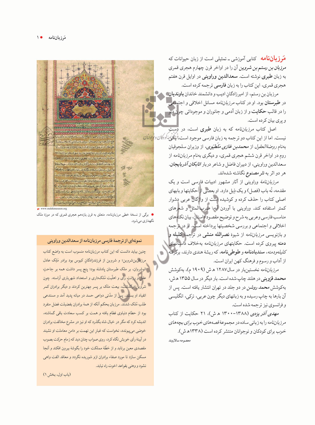 مَرزبان‌نامه کتابی آموزشی ـ تمثیلی است از زبان حیوانات که مرزبان‌ بن رستم بن شروین آن را در اواخر قرن چهارم هجری قمری به زبان طبری نوشته است. سعدالدین وراوینی در اوایل قرن هفتم هجری قمری، این کتاب را به زبان فارسی ترجمه کرده است.