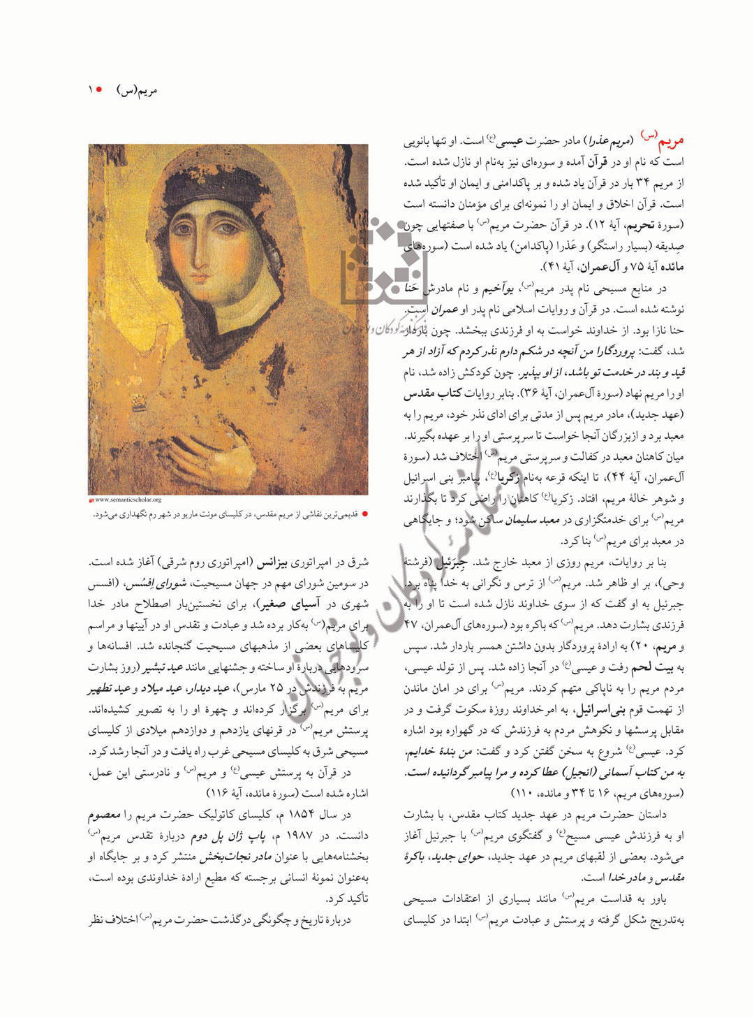 مریم(س) (مریم عذرا) مادر حضرت عیسی(ع) است. او تنها بانویی است که نام او در قرآن آمده و سورهای نیز بهنام او نازل شده است. از مریم 34 بار در قرآن یاد شده و بر پاکدامنی و ایمان او تأکید شده است. قرآن اخلاق و ایمان او را نمونهای برای مؤمنان دانسته است (سورۀ تحریم، آیۀ 12). در قرآن حضرت مریم(س) با صفتهایی چون صِدیقه (بسیار راستگو) و عَذرا (پاکدامن) یاد شده است (سورههای مائده آیۀ 75 و آلعمران، آیۀ 41).