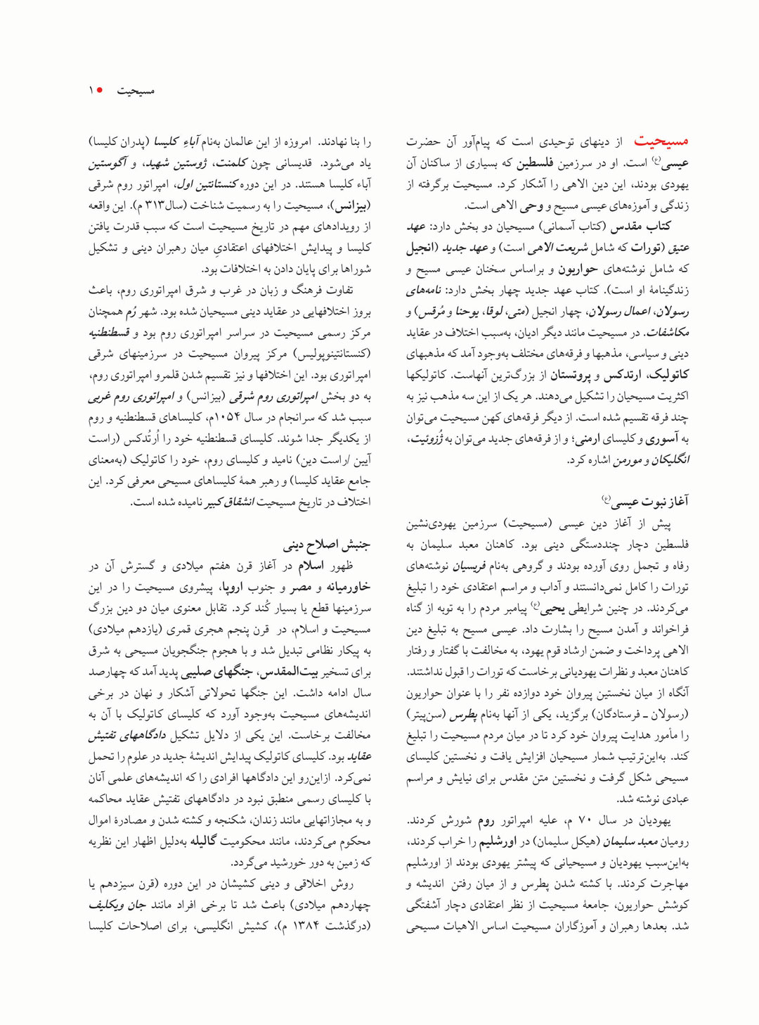 مسیحیت از دینهای توحیدی است که پیامآور آن حضرت عیسی(ع) است. او در سرزمین فلسطین که بسیاری از ساکنان آن یهودی بودند، این دین الاهی را آشکار کرد. مسیحیت برگرفته از زندگی و آموزههای عیسی مسیح و وحی الاهی است. مسیحیت مسیحیت