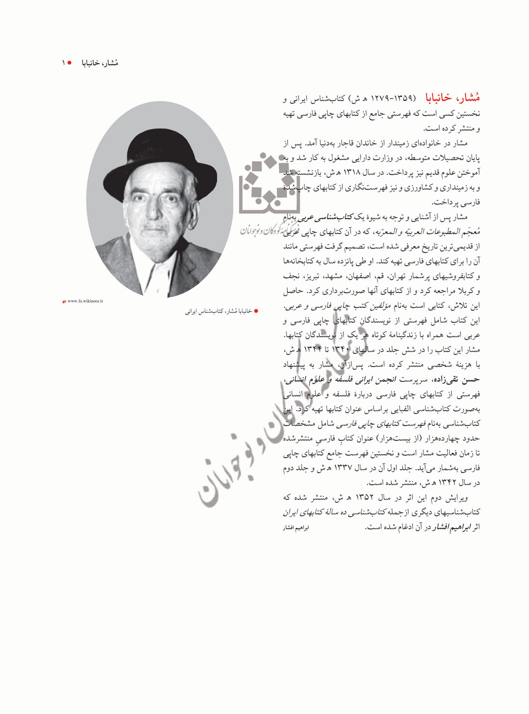 مُشار، خانبابا (1279-1359 ﻫ ش) کتاب‌شناس ایرانی و نخستین کسی است که فهرستی جامع از کتابهای چاپی فارسی تهیه و منتشر کرده است.