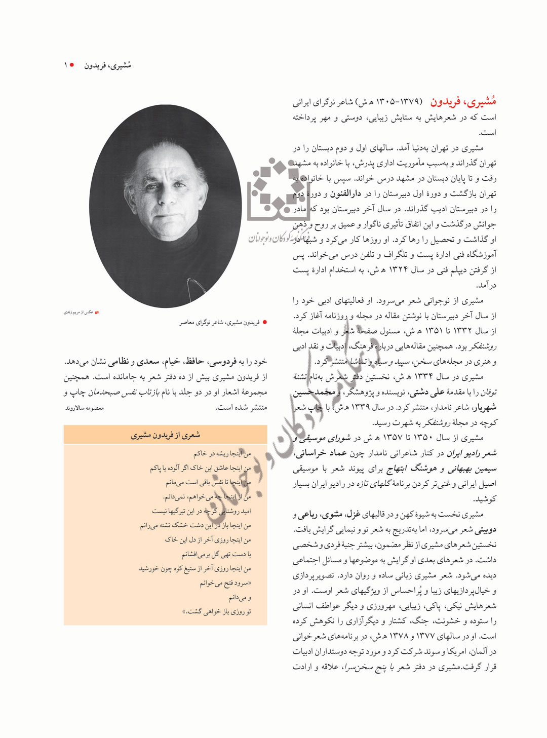 مُشیری، فریدون (1305-1379 ﻫ ش) شاعر نوگرای ایرانی است که در شعرهایش به ستایش زیبایی، دوستی و مهر پرداخته است.