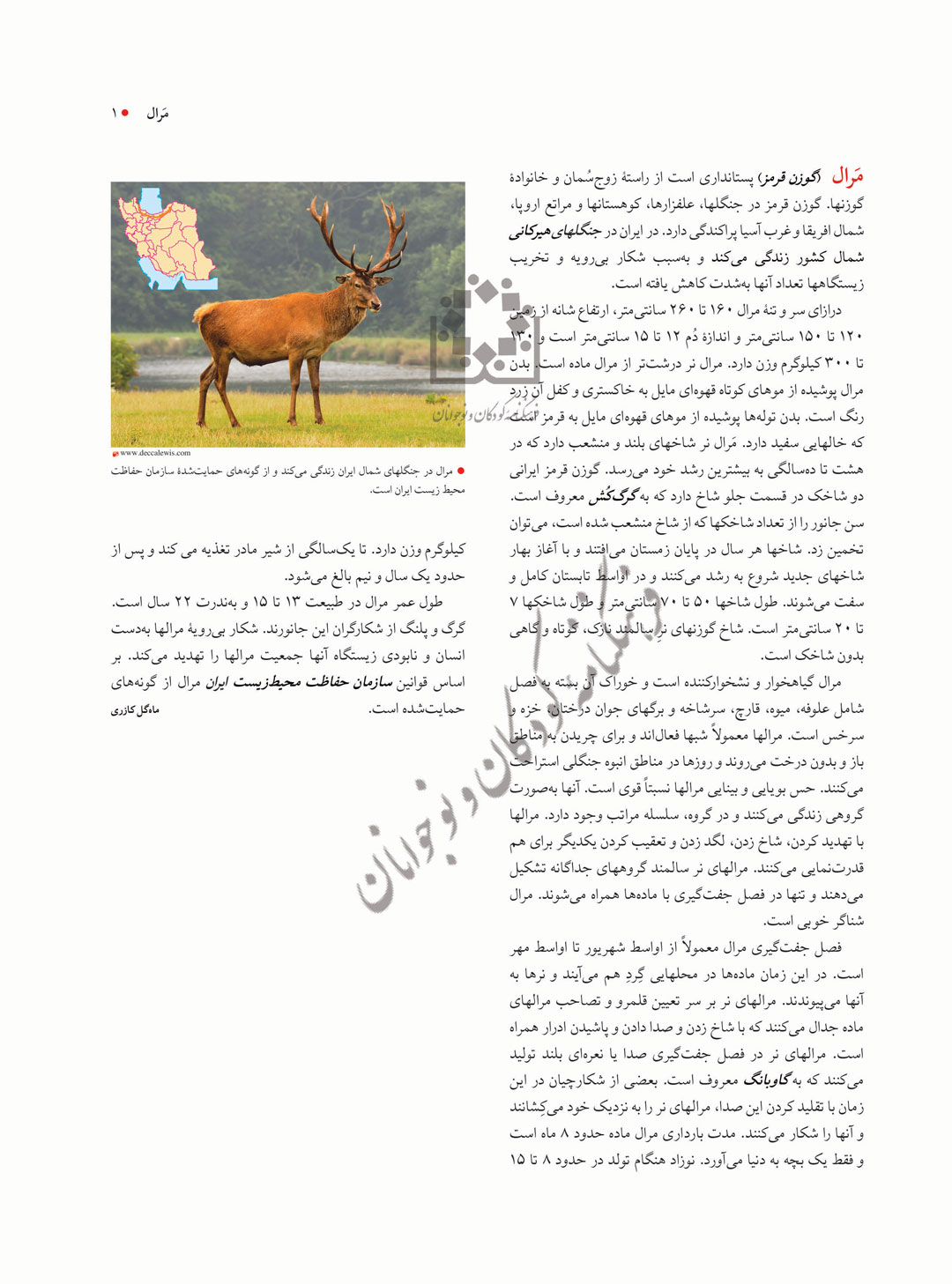 مَرال (گوزن قرمز) پستانداری است از راستۀ زوج‌سُمان و خانوادۀ گوزنها. گوزن قرمز در جنگلها، علفزارها، کوهستانها و مراتع اروپا، شمال افریقا و غرب آسیا پراکندگی دارد. در ایران در جنگلهای هیرکانی شمال کشور زندگی می‌کند و به‌سبب شکار بی‌رویه و تخریب زیستگاهها تعداد آنها به‌شدت کاهش یافته است.