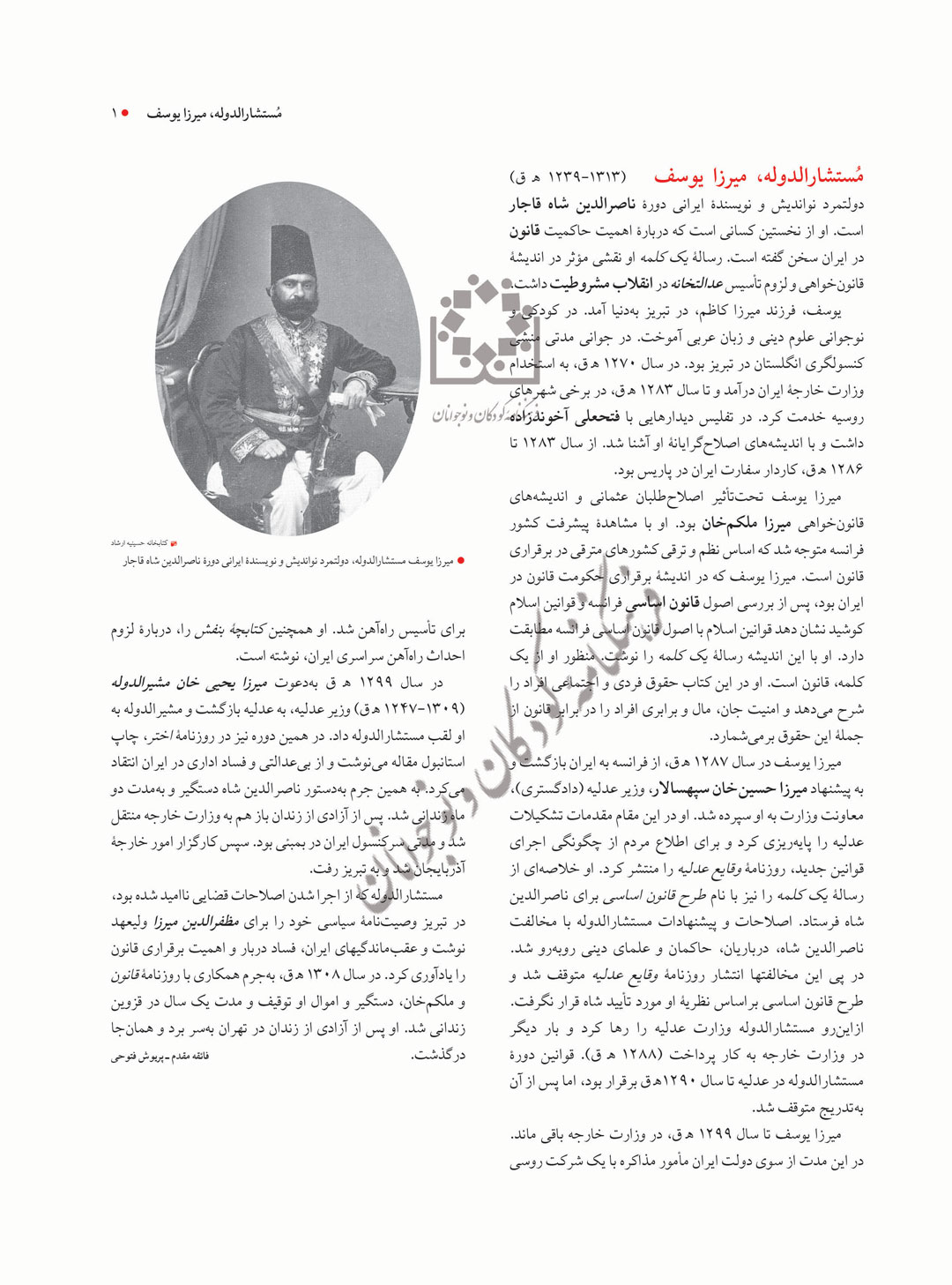 مُستشارالدوله، میرزا یوسف (1239-1313 ﻫ ق) دولتمرد نواندیش و نویسندۀ ایرانی دورۀ ناصرالدین شاه قاجار است. او از نخستین کسانی است که دربارۀ اهمیت حاکمیت قانون در ایران سخن گفته است. رسالۀ یک کلمه او نقشی مؤثر در اندیشۀ قانون‌خواهی و لزوم تأسیس عدالتخانه در انقلاب مشروطیت داشت.